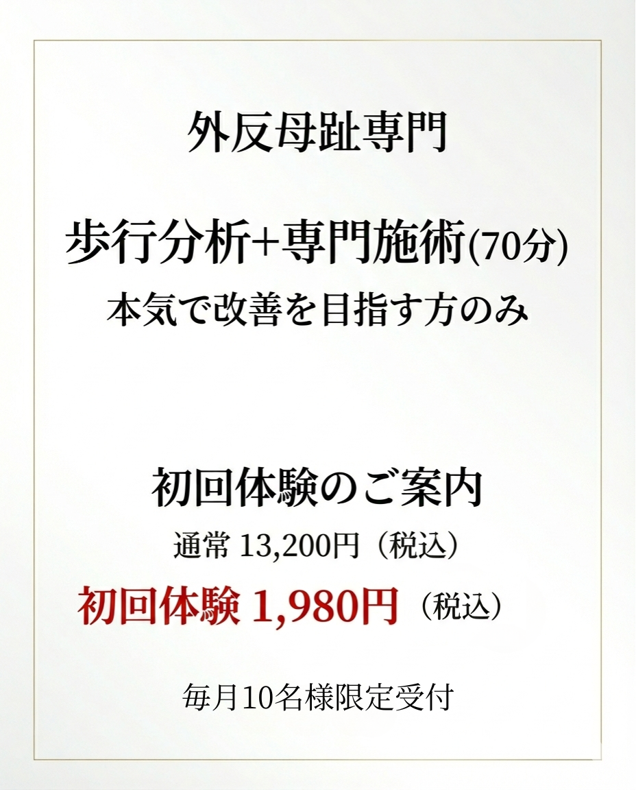 に基づいています 73 レビューTrustindex は、レビューの元のソースが Google であることを確認します。 外反母趾が気になり、ネット検索でのご縁でした。 身体の悩みは他にも、学生の頃から太ももの張りや腰痛、肩こりが慢性的にありました。 6月から歩行レッスンを始めて、3カ月が経ち、外反母趾の改善はもちろん、足のむくみ、太ももの張りや腰痛、肩こりなどの身体の悩みがなくなりました! 歩き方を変えるだけで、こんなに身体の状態が変わるんだ…!ということを実感することができました! 身体のラインが変わり、色々な方から「痩せたね」、「垢抜けたね」と言われるようになりました! 今まで諦めていた服や靴を選べるようになり、おしゃれを楽しめるようになりました◎ 先生は知識豊富で、身体の疑問に思ったことに関して丁寧に答えてくれます! 施術はソフトにも関わらず、効果は絶大で身体がすごく楽になります。 通うたびに感動があり、通うのがすごく楽しみになっております! 整体関節ラボさんに出会えて本当に良かったです! 自分の身体の状態を知ることがいかに大事かを学ぶことができました! 20代に一生の健康法を教えていただけて、運が良かったと思います! 身体の不調で悩んでいる方にぜひ行って欲しいです! おすすめです! つなTrustindex は、レビューの元のソースが Google であることを確認します。 年々酷くなっている気がしていた外反母趾。 気になりながらも痛みが無かったので放置していましたが、履きたい靴が履けなかったショックでネットで色々と検索して関節ラボさんに辿りつきました。 最初は歩き方で改善するの?と半信半疑でしたが、先生の熱心な指導と日々の姿勢と歩き方を意識して4ヶ月後の測定で11.5°の改善! おまけに親指の側面のタコもできなくなりました。 とても話しやすい先生なので、外反母趾でお悩みの方は一度ご相談されてはどうでしょうか。これは一生モノだと思います!! きなこきなこTrustindex は、レビューの元のソースが Google であることを確認します。 半年間の歩行レッスン+終了後の無料検診が終わりました! 10代の頃から外反母趾で、外反母趾の見た目のせいで人前で裸足になることが恥ずかしかったり、履ける靴が限られることが悩みでした。痛みはあったりなかったりで、長時間立ちっぱなしの時やヒールのある靴を履いた時は痛みが出ていました。 また、足(特にふくらはぎ)が疲れやすく、階段を上がるだけで足に疲労感があり、仕事時も(立ち仕事です)半日経てばふくらはぎがパンパンになっていました。毎晩のように夫にふくらはぎのマッサージをしてもらっていたくらいです。 まず初回で正しい立ち方を指導してもらったのですが、驚いたのは、立ち方を変えた2日後には仕事中のふくらはぎの疲労感がなくなったことです。毎晩のマッサージも気づいたら無くなっていました! 立ち方、歩き方、座り方、それぞれ指導していただき、外反母趾の角度もレッスンを重なる度に改善していったので、通ってよかったと思います。足裏を測定してくれるので、見た目だけでなく数値として見れることも良かったです。 引き続き、これまで指導してもらったことを意識して生活していきたいと思います。 みとTrustindex は、レビューの元のソースが Google であることを確認します。 60歳を過ぎて親指の付け根や膝に激しい痛みや親指の角度異常に、 初めて自分が外反母趾なんだと自覚しました。思い起こせば、ある時々で痛みが起こり靴が合わないんだと嘆いていたのを思い出します。整形外科では手術を勧められて躊躇していました。手術しないで治す方法を何気なく検索していたら整体関節ラボを見つけ、口コミを真剣に読んでいたら気持ちがパッと明るくなり、直ぐにトライアルに挑戦。あっという間の半年間でした。田中先生のひたすら真面目で熱心なご指導により、毎回改善され信じて続けて良かったです。 初回の姿勢歩き方を変えただけで全く痛みが消え去り、びっくり仰天。あの辛かった痛みは何だったんでしょう。今悩まれてる皆様是非お勧めしたいです。 毎日朝夕1時間のウォーキングや趣味の⛳️も出来て幸せです。 田中先生感謝感謝です。 松本Trustindex は、レビューの元のソースが Google であることを確認します。 長い間外反母趾で悩んでおりました。痛みは若い頃にはズキズキがありましたがそれでも痛みは消えていました。が突き出た骨を見るとあまりにも不細工で…。関節ラボさんを知ったのは昨年夏あたりから外反母趾周辺(親指、人差し指の付け根や甲)に痛みが出始めてネットでどこか専門がないものかと探していました。それでラボさんに目がとまり…しかし数カ月勇気がでず…笑 昨年11月中旬にトライアルで伺いました! ずっと靴のせいだと思っていたのですが(毎日パンプス)、歩き方によるものだと教えて頂き思い当たる事もあったので、続けてみる事にしました。ただ大変申し訳なく私の諸事情で約2ヶ月毎週でお願いしました。